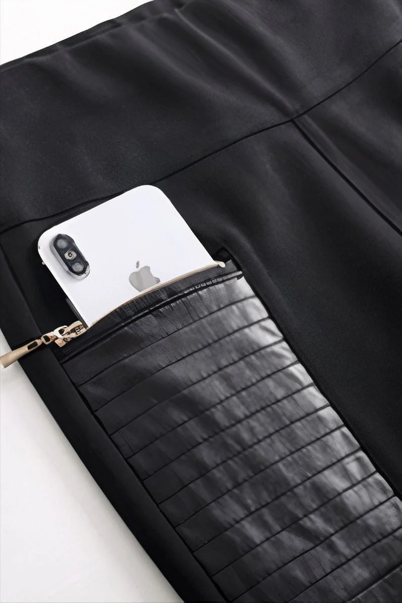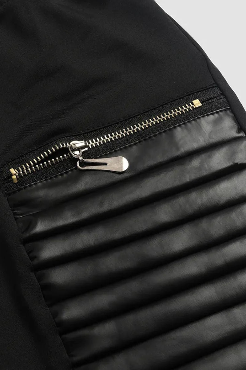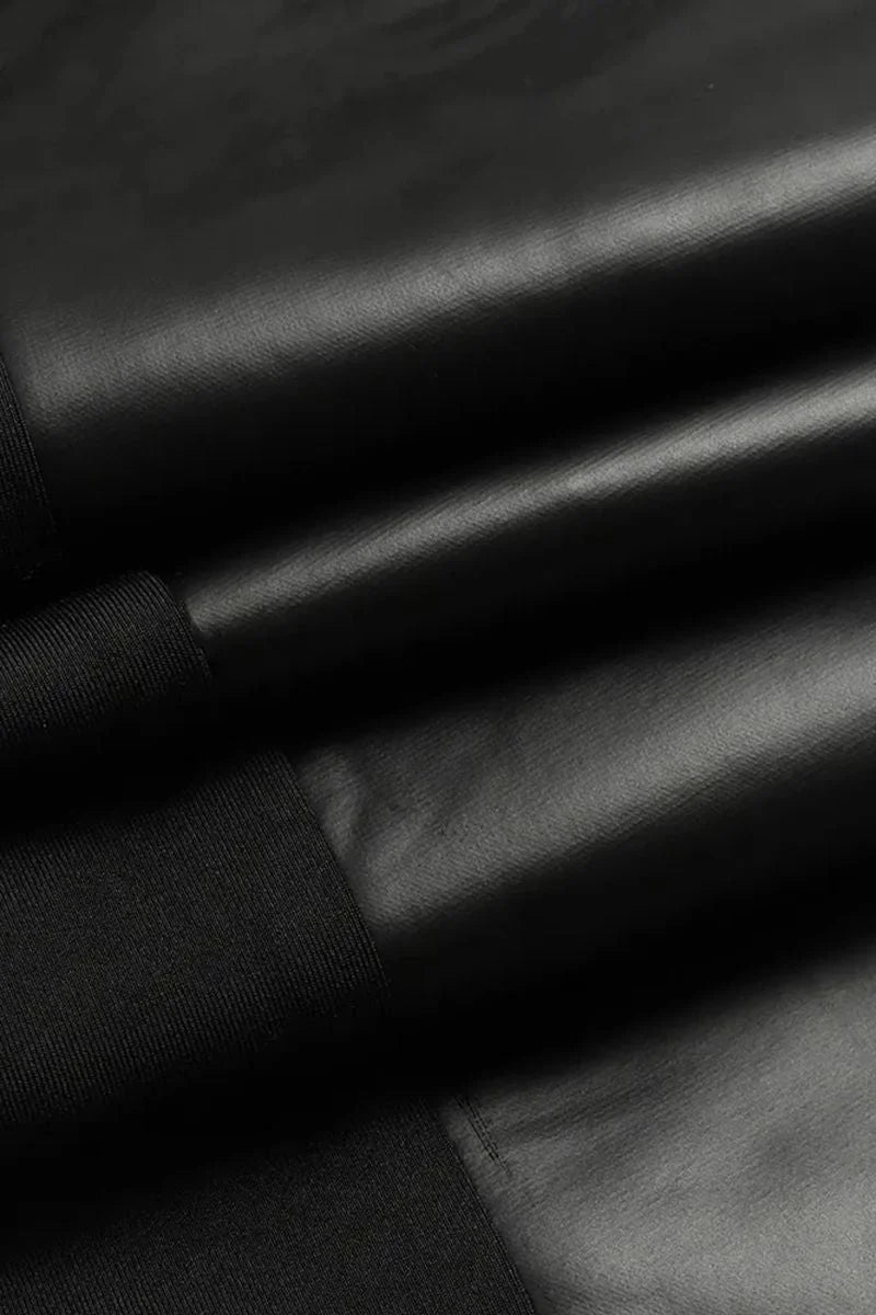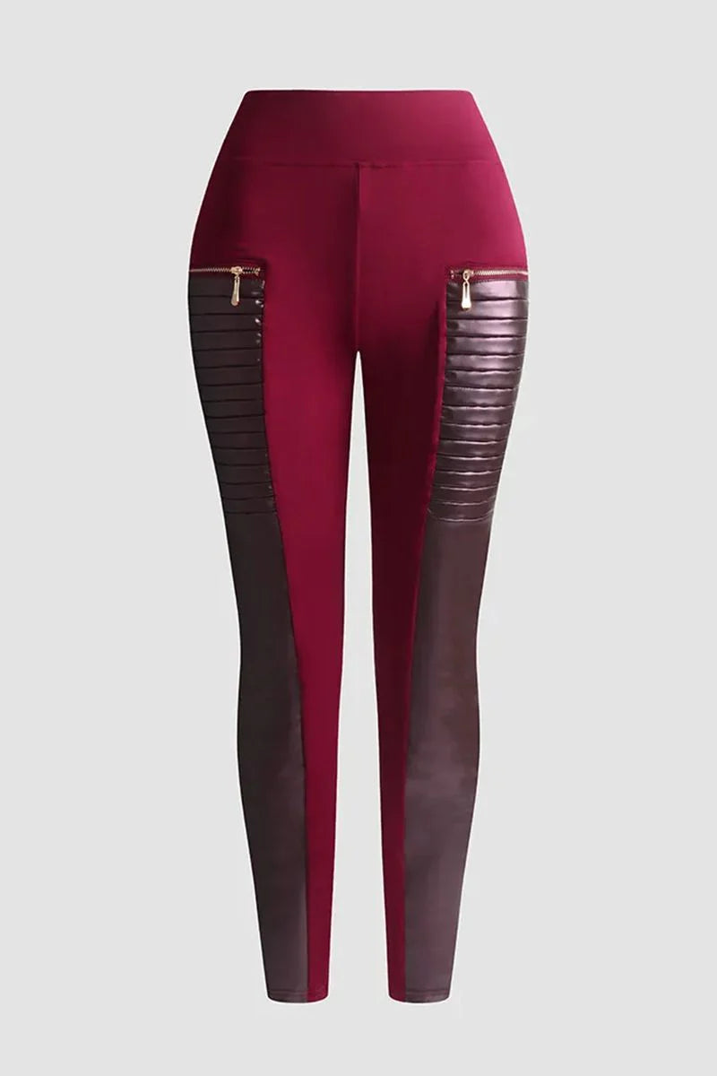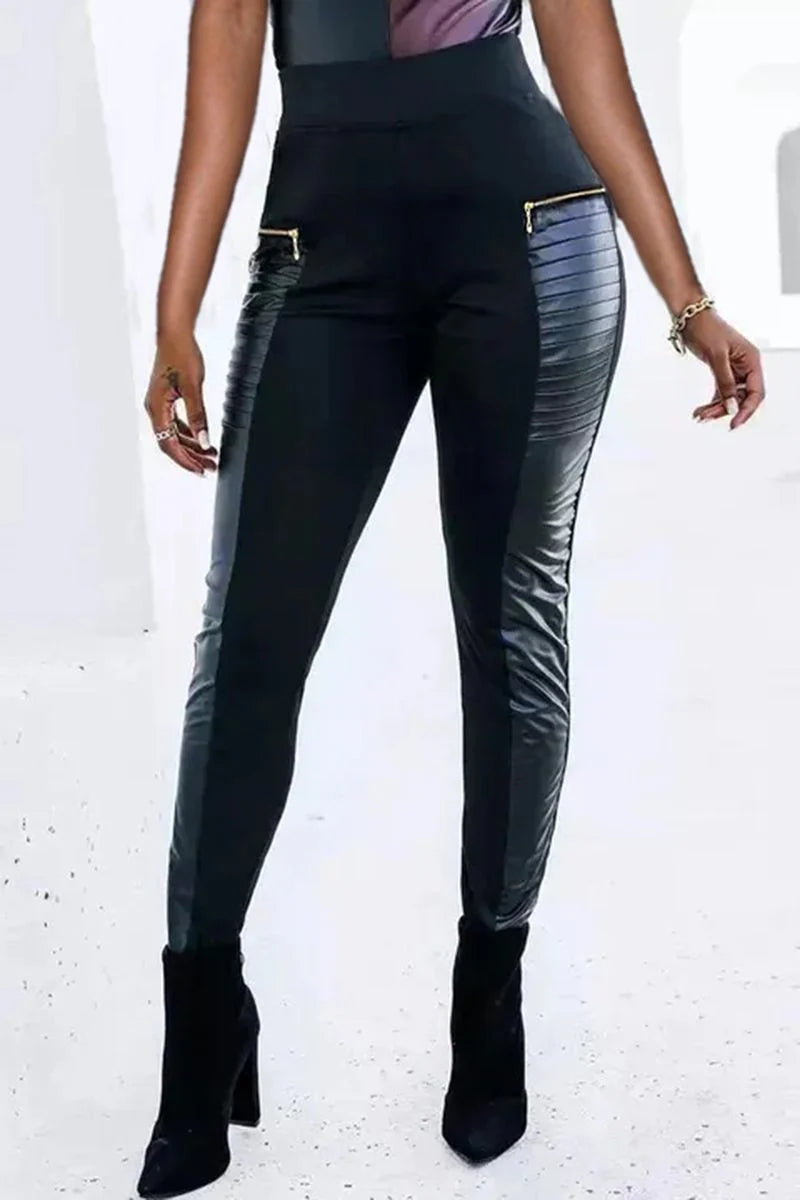 产品广告语:?Spodnie ze sztucznej skóry: twarda kontrastowa tapicerka, zapięcie na suwak. Wygodne, uniwersalne, eleganckie!?