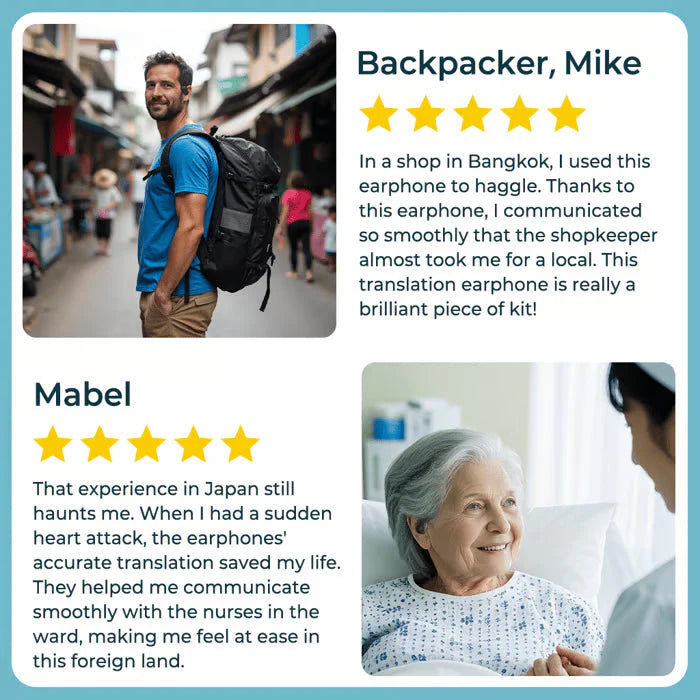 Naše slušalke vam omogočajo enostavno prevajanje in komunikacijo z drugimi v realnem času. Preprosto dajte eno slušalko partnerju, ki bo prevajala pogovor med vama.
