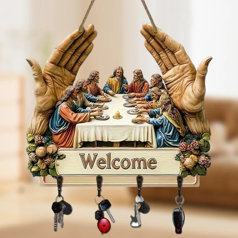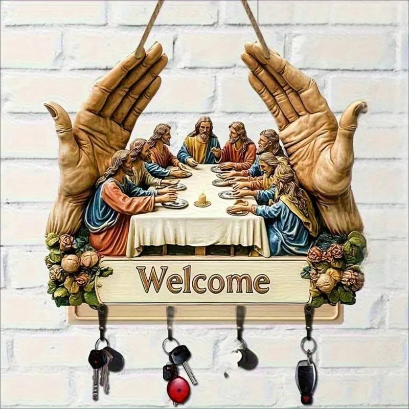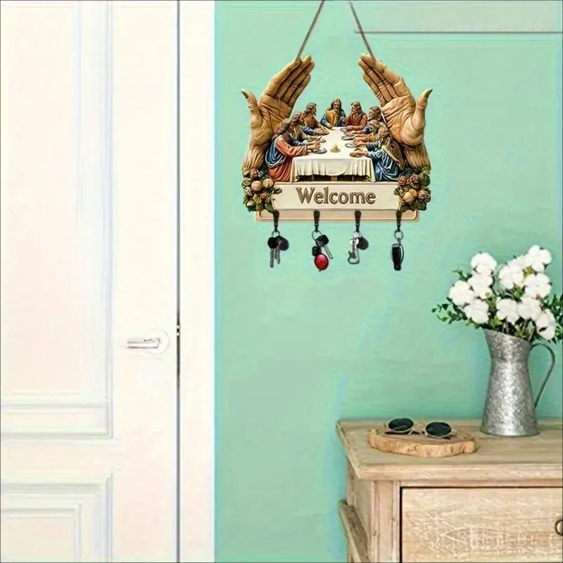 KLASIČNA UMETNIŠKA OBLIKOVANJA: Ta leseni obesek za ključe z ikoničnim motivom "Zadnje večerje" doda notranjosti brezčasno lepoto. Njegov umetniški potisk doda eleganco, hkrati pa združuje dekorativnost s funkcionalnostjo in preprost stenski dodatek spremeni v pomembno umetniško delo za dom.