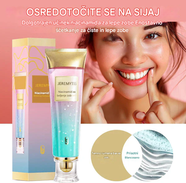 Predstavljajte si nasmeh, ki ni le svetlejši, ampak tudi bolj zdrav. Nasmeh, ki osvetli prostor in vam z vsakim srečanjem poveča samozavest. Poznate ta občutek – tisto rahlo oklevanje, preden se zasmejete, tisto rahlo negotovost, ko spoznate nekoga novega. Kaj če bi se lahko poslovili od teh trenutkov in imeli nasmeh, na katerega ste resnično ponosni? Predstavljamo vam zobno pasto za beljenje zob JEREMYTIS™ z niacinamidom, revolucionarno metodo beljenja zob, ki združuje moč nege kože z nežno in učinkovito ustno nego. Vemo, da si želite več kot le bolj bele zobe. Želite rešitev, ki je nežna do vaših občutljivih dlesni in se brezhibno prilega vašemu natrpanemu življenjskemu slogu.