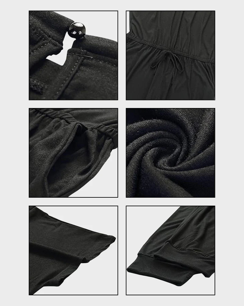 Ta kombinezon, zasnovan z mislijo na vaše obline in udobje, ima visok pas z nastavljivo vrvico in manšete na gležnjih za eleganten zaključek. Zračna tkanina iz mešanice bombaža vas ohranja hladne, globoki stranski žepi pa modi dodajo funkcionalnost. Izrez z odkritimi rameni doda kanček spogledljivosti, ne da bi razkril preveč – popoln za vsak letni čas.