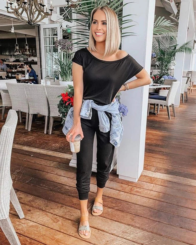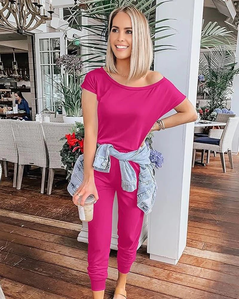V tem kombinezonu z odkritimi rameni se združita lahkotnost in elegancija. Lahkoten izrez, sproščeni kratki rokavi in poenostavljene zožene hlačnice ustvarjajo laskavo silhueto, ki jo lahko nosite kjer koli. Naj bo to hiter obisk kave ali potovanje, ta enodelni komplet združuje sproščeno udobje z ženstvenim šarmom – preprosto ga oblecite in že ste pripravljeni.