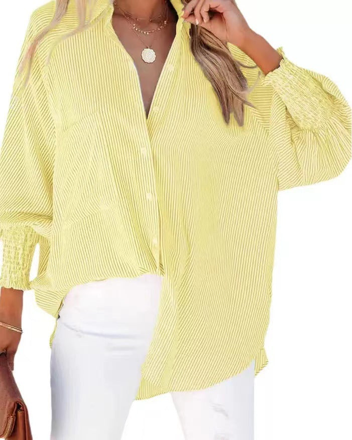 Srajca za fante z nabranimi manšetami: ležerne črtaste srajce za ženske z žepi, eleganten V-izrez, črtast potisk, nabrana srajca z dolgimi rokavi, poletne tunike za ženske. Ležeren in kreativen dizajn vam daje eleganten in očarljiv videz.