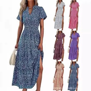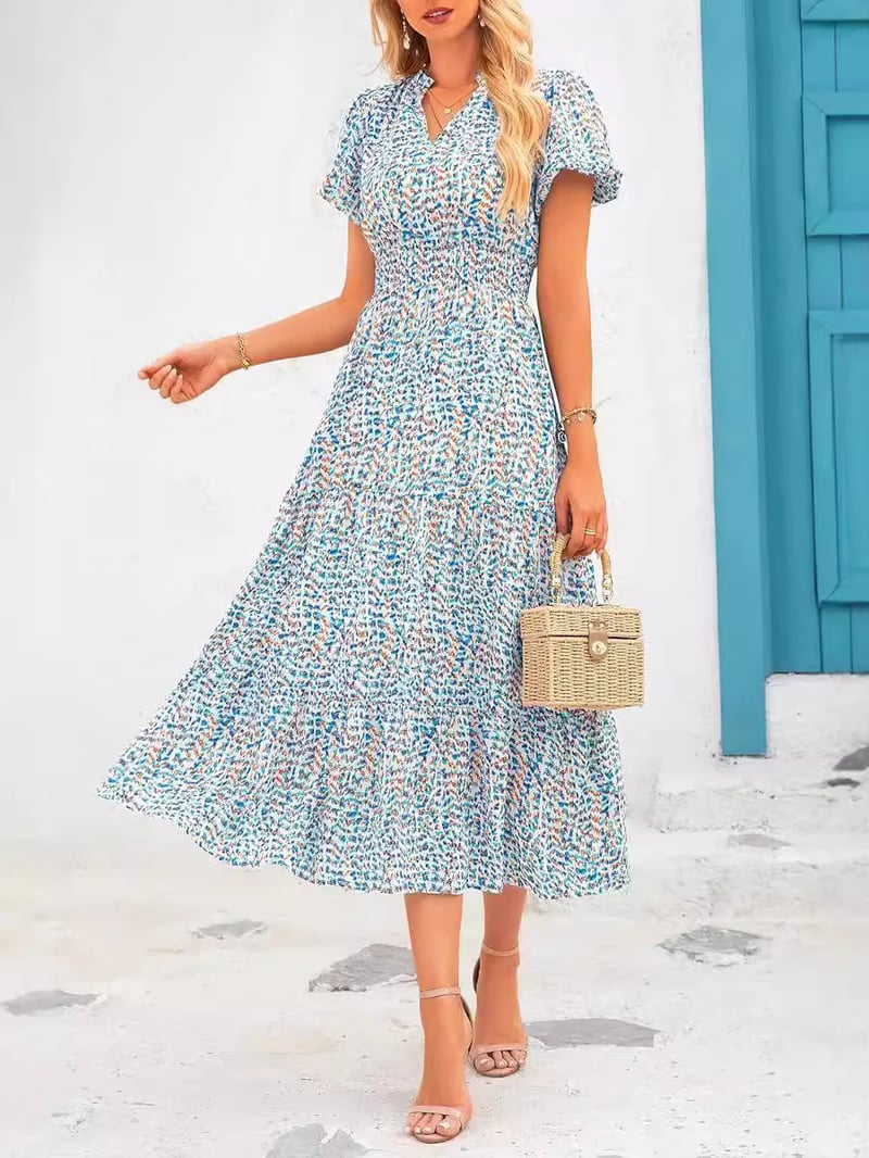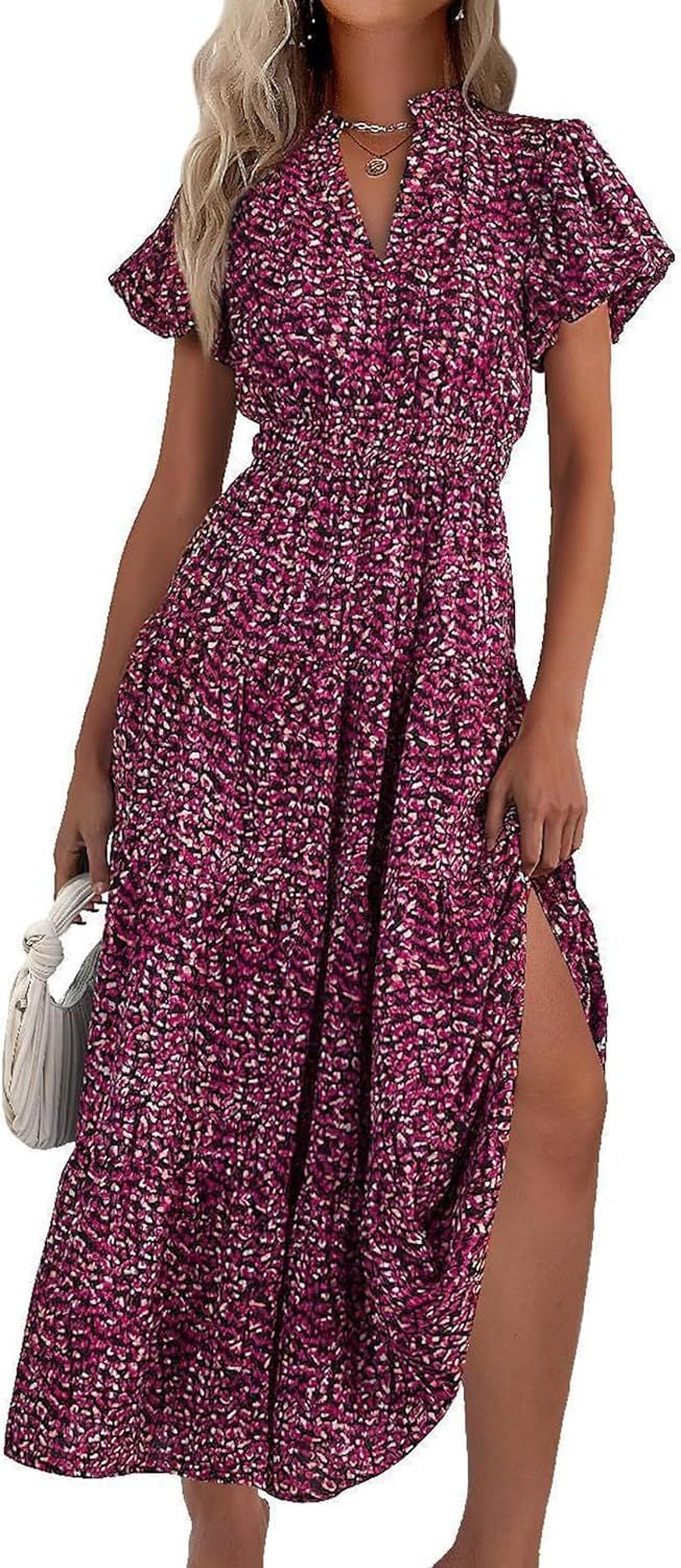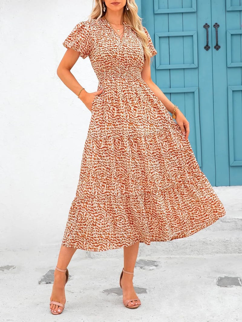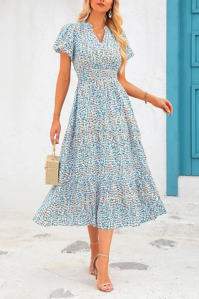 Poboljšajte svoju ljetnu garderobu našom ženskom haljinom A-kroja s cvjetnim printom i V-izrezom, midi krojem i elegantnim mjehurićastim rukavima. Dizajnirana za modernu putnicu i modnu entuzijasticu, ova haljina kombinira bezvremensku eleganciju sa suvremenim stilom, što je čini nezaobilaznom za vaše odmore.