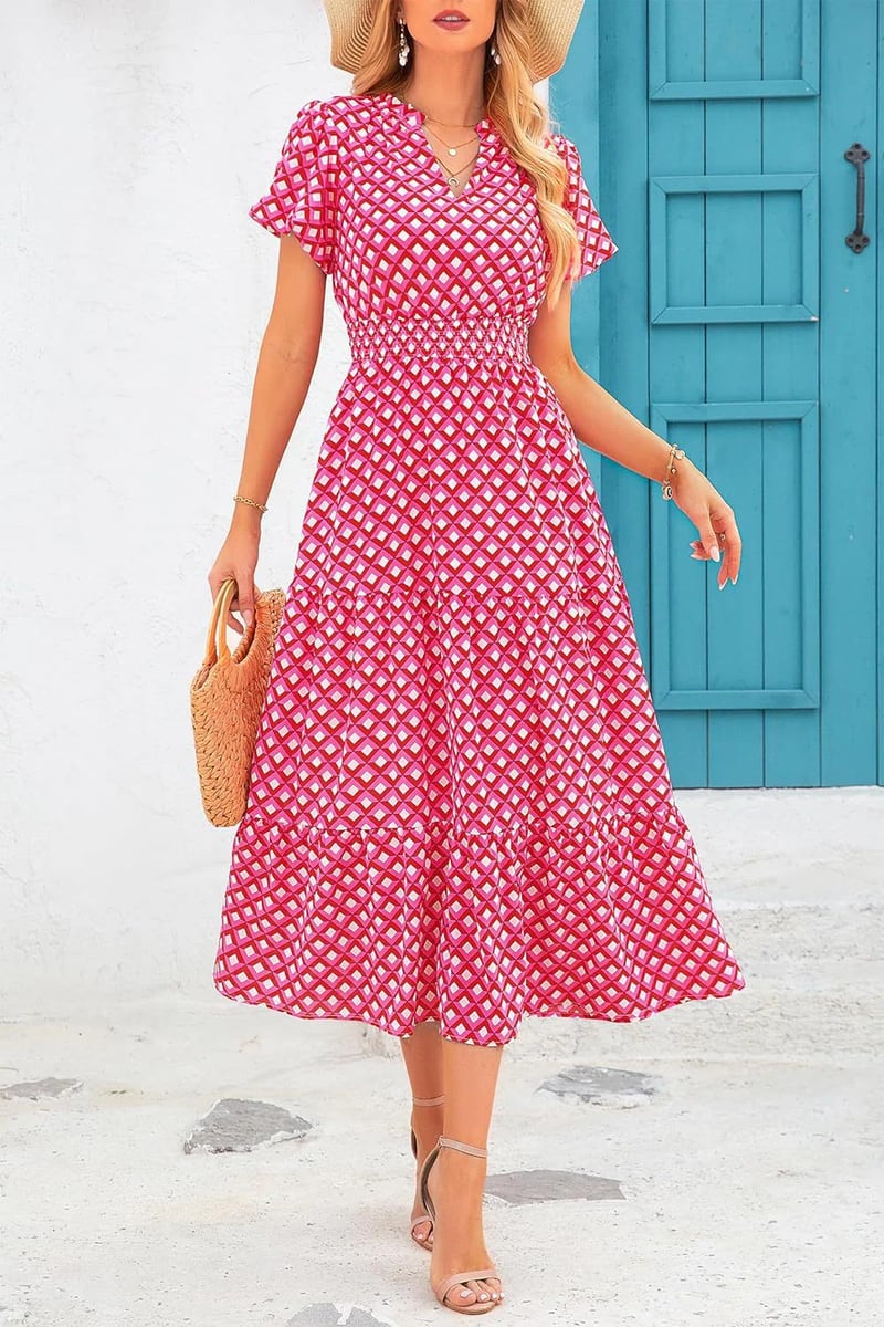 Zakoračite u ljetnu eleganciju s našom ženskom midi haljinom s cvjetnim printom i V-izrezom